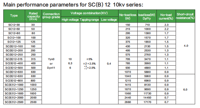 | ±5% or ±2×2.5% | 3.15,6 ,6.3,10 10.5 or 11 | Yyn0 Dyn11 | 6 | 2220 | 8180 | 0.6 | 50 |